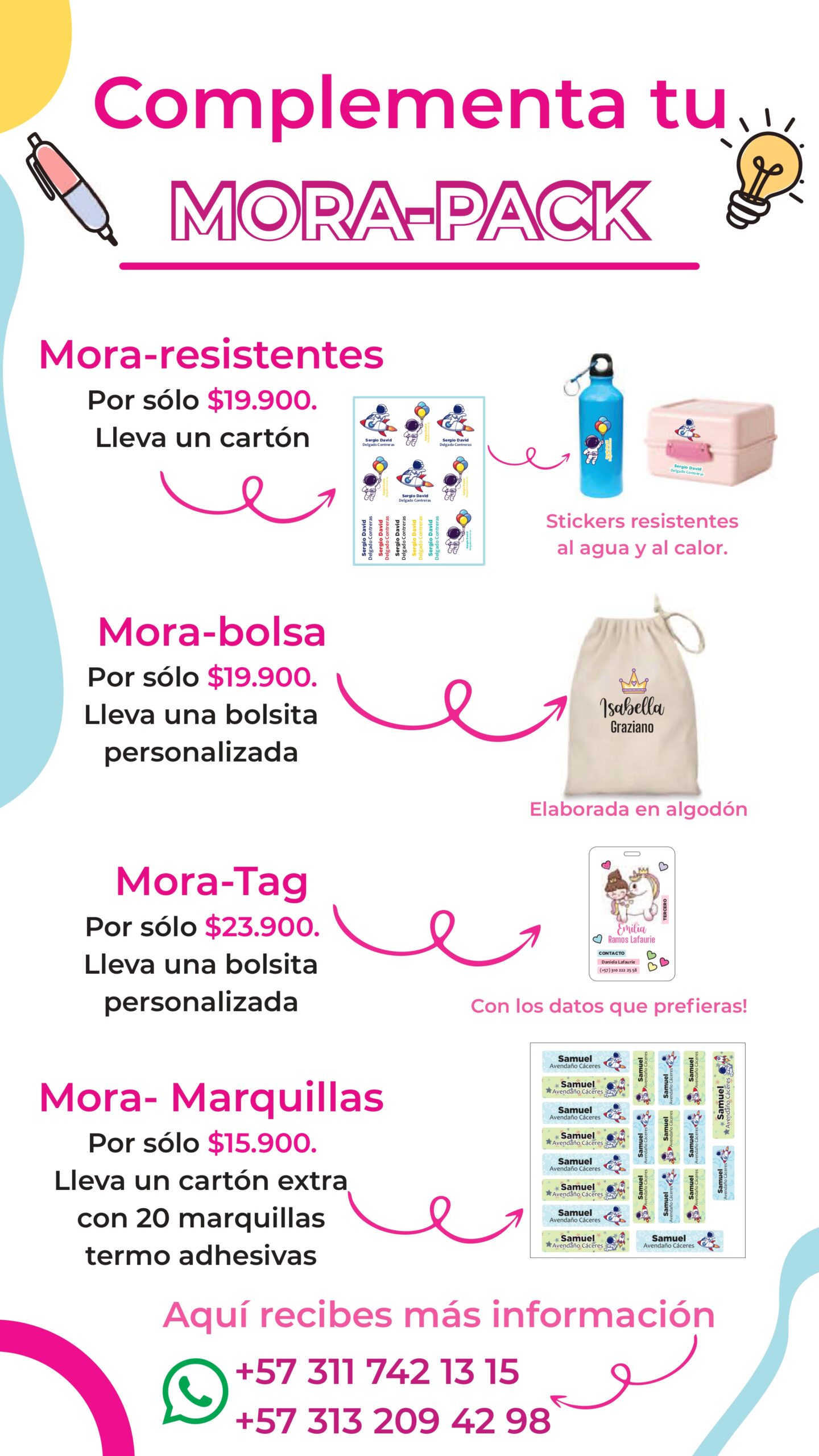 📦 Agrega uno, dos… o todos a tu carrito y transforma tu Mora Pack en una solución completa para marcar todo el mundo escolar de tu hijo.